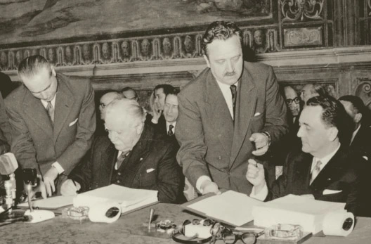 V roce 1957 byl totiž Lambert Schaus pověřen podpisem Římské smlouvy, kterou jako prezident lucemburské delegace pomáhal vyjednávat. Tím se Lucembursko stalo jedním ze šesti zakládajících států Evropského hospodářského společenství (předchůdce Evropské unie) a Euroatomu, jehož úkolem je podpora jaderného výzkumu a bezpečnosti v Evropě.